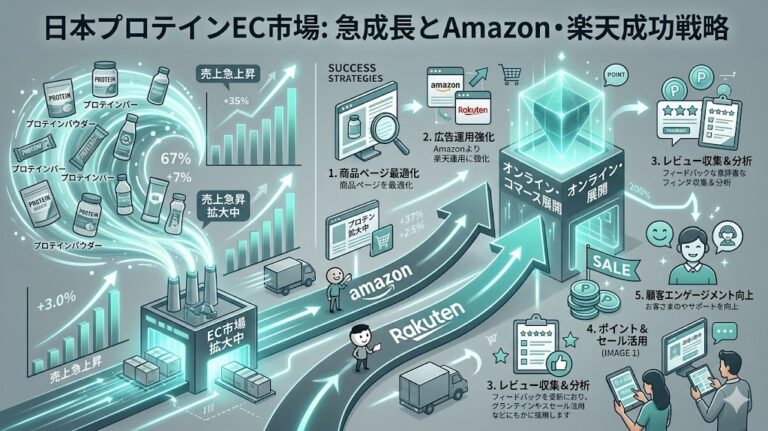 プロテインのEC(オンライン通販)市場は2024年も年々拡大を続けており、「量から質へ」「一般層・女性の需要拡大」という2つの大きなトレンドが市場を牽引しています。Amazon、楽天、Yahoo!ショッピングなどのECプラットフォームでは、大手ブランドから個人起業家まで、多様なプレイヤーが参入し、激しい競争を繰り広げています。本記事では、プロテインEC市場の最新動向と、成功するための具体的戦略を詳しく解説します。
